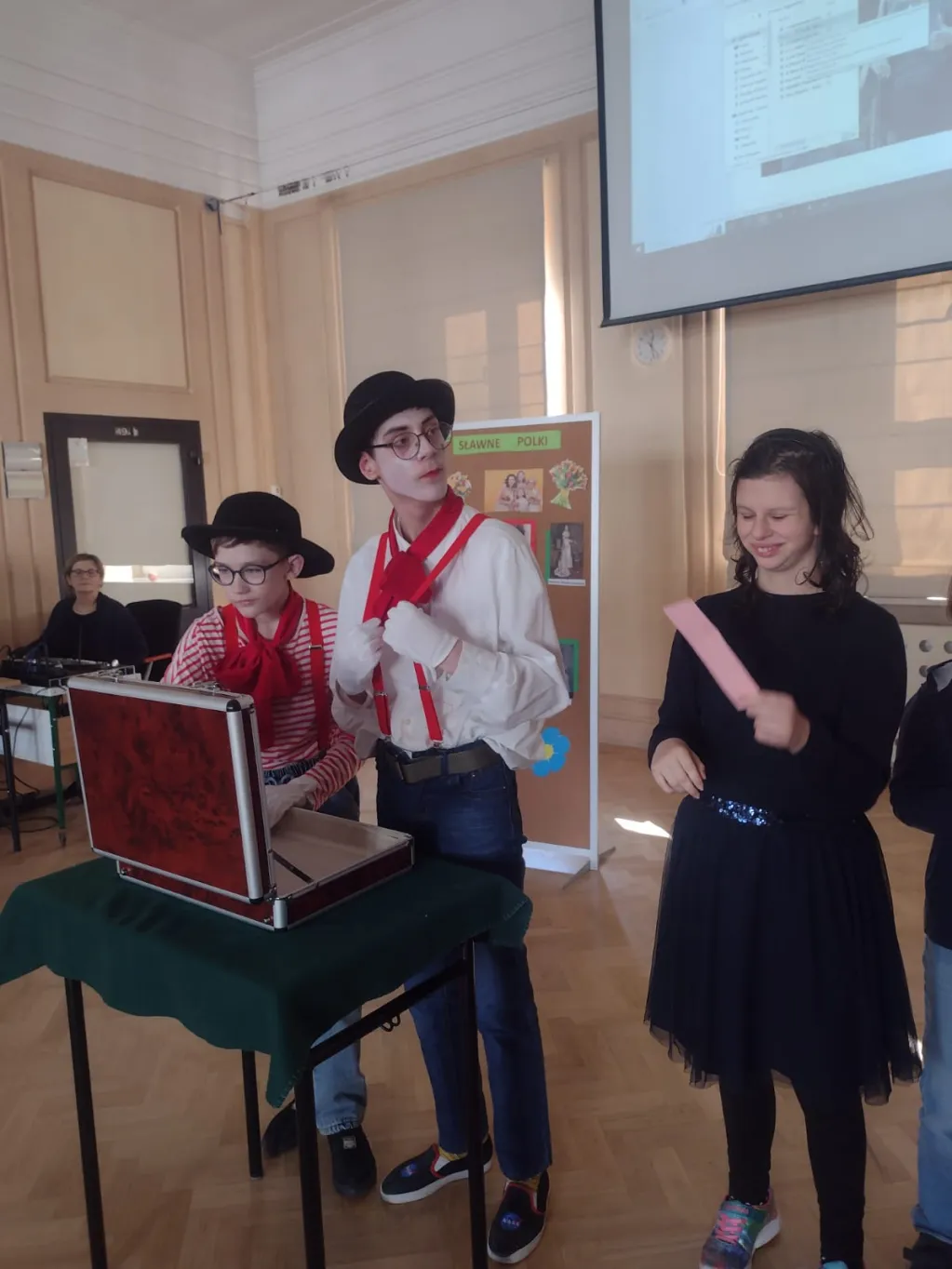 Troje tajemniczych i sympatycznych mimów wyczarowywało ze swojej walizeczki prezenty i niespodzianki. Wystarczyło uruchomić wyobraźnię i można było się cieszyć z baloników, kotka, pieska, lizaków, cukierków, kwiatów, a nawet roweru!