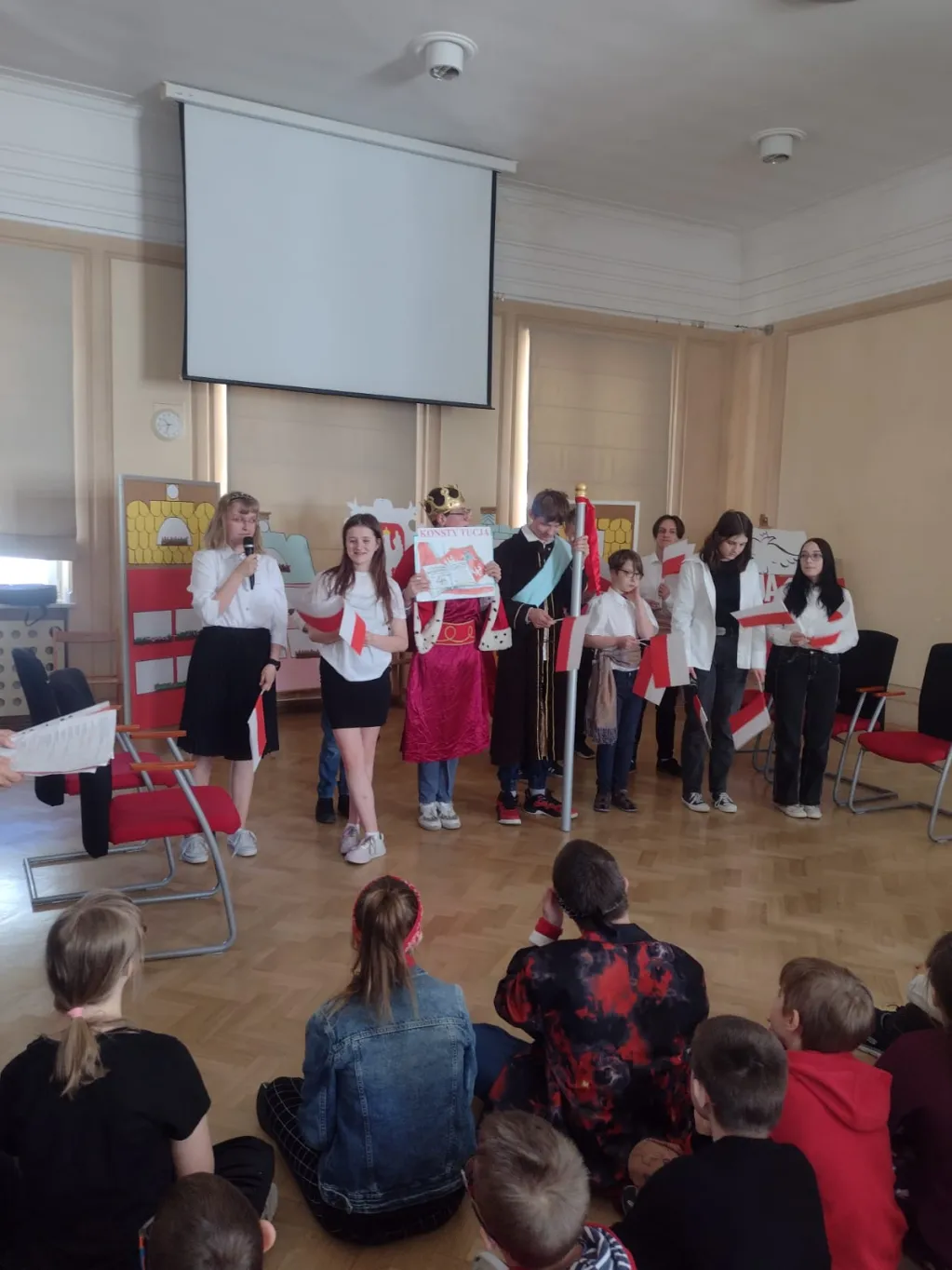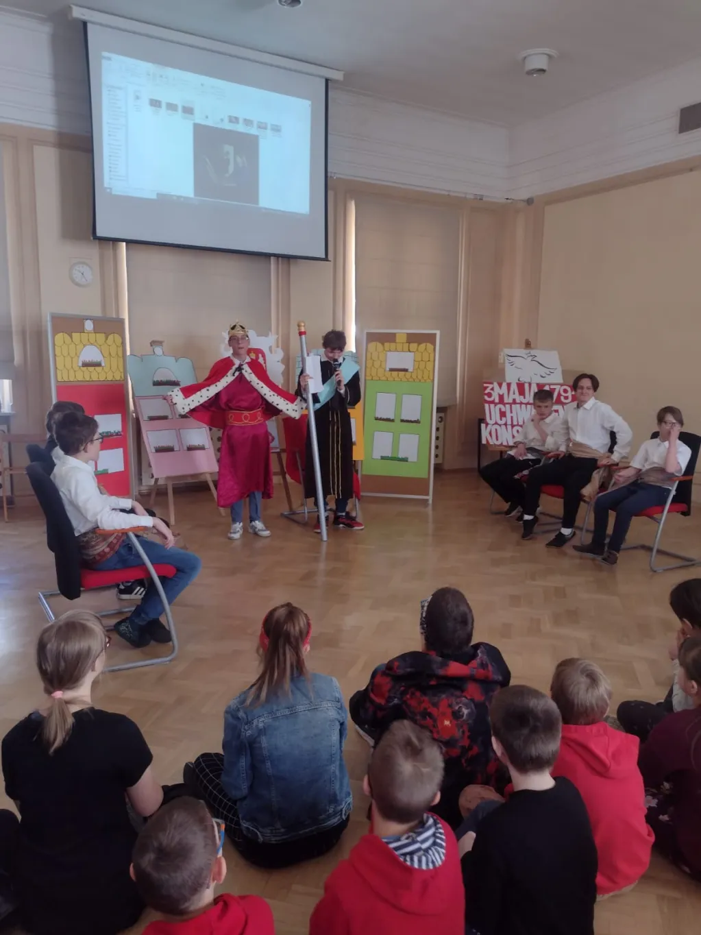 Wtedy właśnie została uchwalona pierwsza w Polsce i pierwsza w Europie konstytucja. Ten ważny dokument zawierał prawa i obowiązki obywateli, dzięki którym można było przeprowadzić ważne reformy w naszym kraju. Uczniowie klas 5, 7 i 8 wystąpili w przedstawieniu przypominającym tamtą historyczną chwilę i nadzieje Polaków na uratowanie chylącej się ku upadkowi i zagrożonej przez zaborców Rzeczpospolitej. Był też akcent współczesny. Zespół Razi Prąd (czyli uczniowie klasy 4d) w emocjonalnym wykonaniu przedstawił piosenkę o znaczeniu wolności.