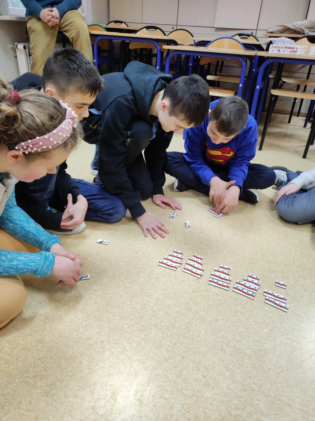 Kolejną grą była gra „Nogi stonogi”, która także pomagała nam w ćwiczeniu naszych umiejętności tworzenie własnych strategii, podejmowania decyzji oraz oceniania ryzyka. Doskonaliliśmy także umiejętność liczenia.